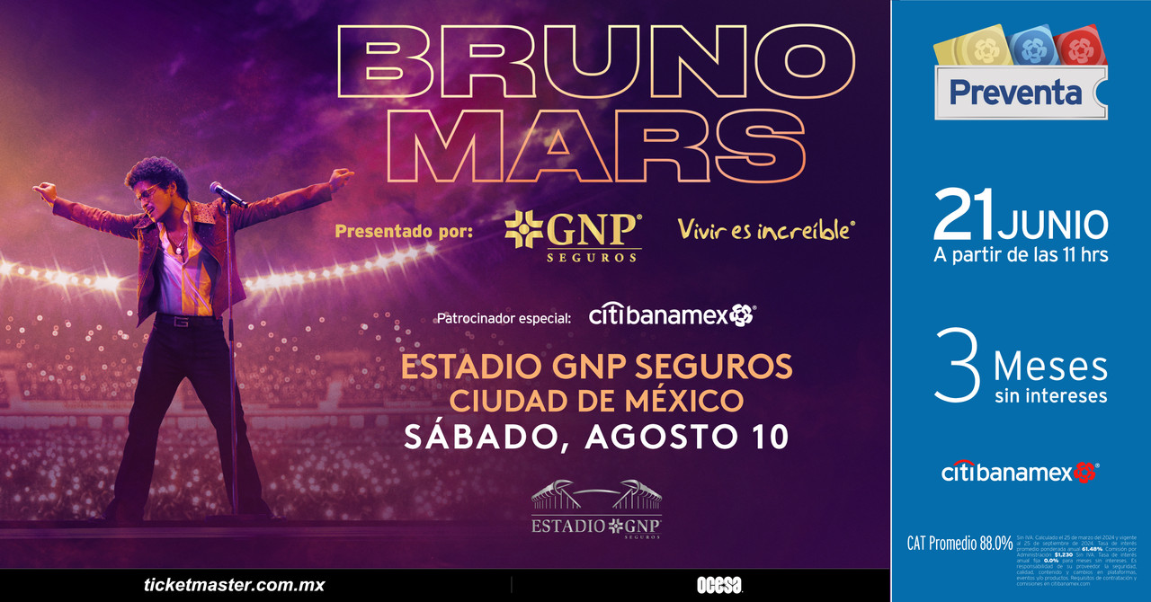 ¡La cita con Bruno Mars es el 10 de agosto en el Estadio GNP Seguros! Los boletos estarán disponibles en preventa Citibanamex el 21 de junio y en venta para el público en general el 22 de junio a través de: