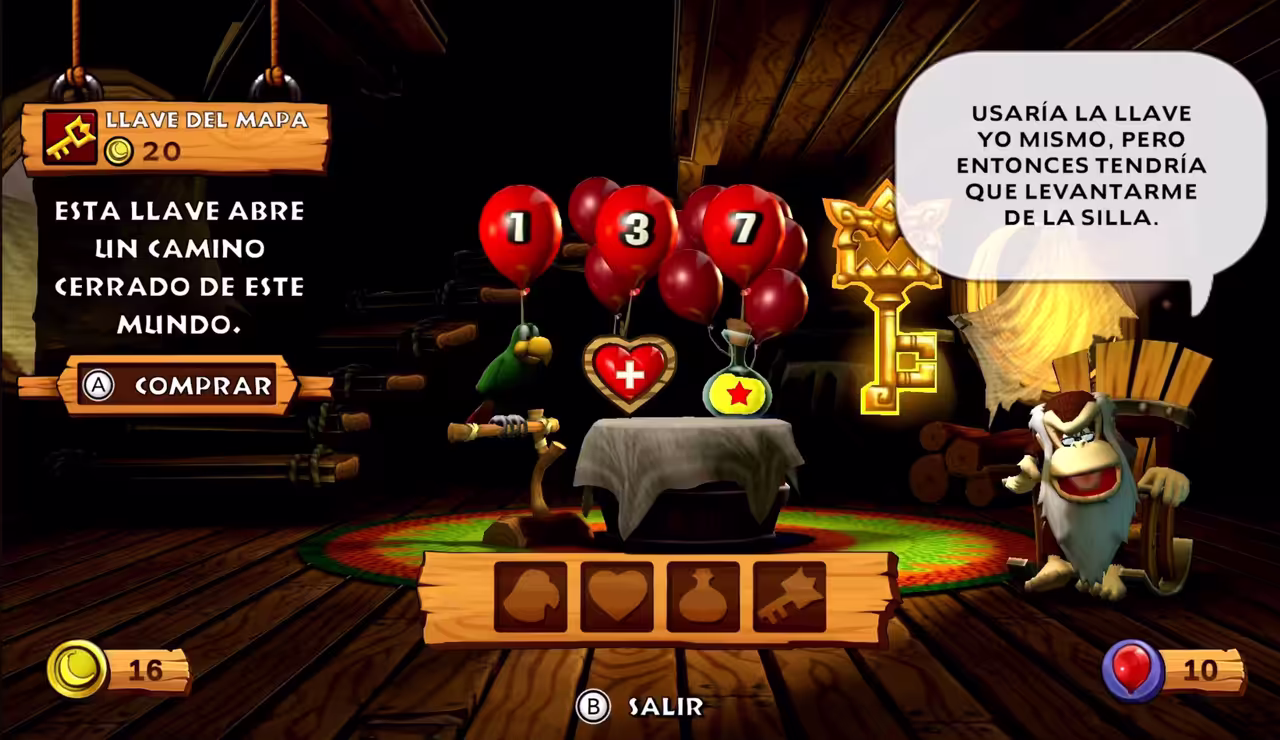 Además, hay un nuevo modo de juego que ofrece varias ventajas a los jugadores, como aumentar la barra de salud de dos a tres corazones y brindar acceso a una variedad de artículos útiles que se pueden comprar en la tienda de Cranky Kong. Estos artículos incluyen un globo verde que te salva de caer a tu perdición y una poción que te permite recibir un golpe adicional durante los niveles especiales de vehículos.