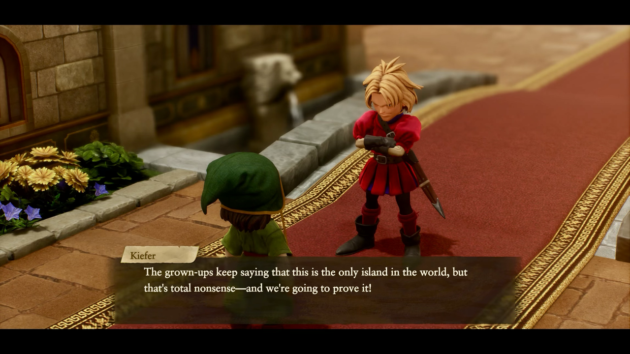 En Dragon Quest VII: Reimagined comenzamos nuestra travesía como Gordoorukun, el hijo de un joven pescador que vive en una pequeña isla que, según todos, es todo lo que existe. Junto a él está Kiffer, príncipe del reino de Starda y mejor amigo, con quien comparte una curiosidad casi peligrosa por lo que se esconde más allá del horizonte.