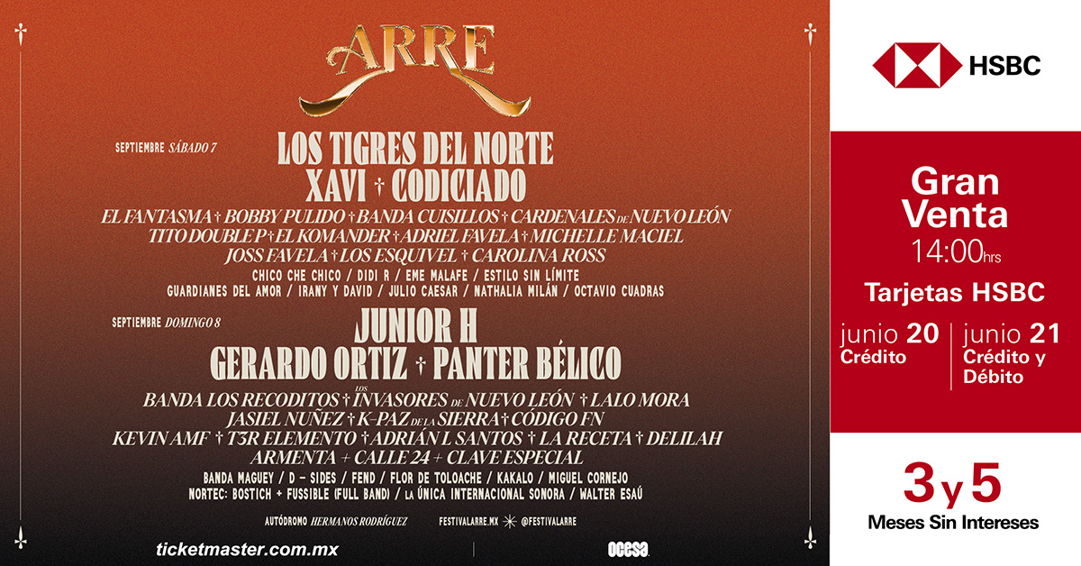 La cita es el 7 y 8 de septiembre en el Autódromo Hermanos Rodríguez. Los boletos estarán disponibles en preventa HSBC el 20 y 21 de junio a las 2:00 p.m., y posteriormente en las taquillas del lugar y a través de Ticketmaster. No te pierdas la oportunidad de ser parte de esta increíble celebración de nuestra música y cultura. ¡Nos vemos en ARRE 2024!