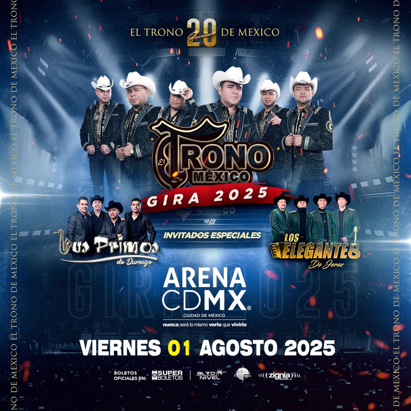 La emblemática agrupación EL TRONO DE MÉXICO traerá su gira Seguimos Firmes 2025 a la Arena CDMX el próximo 1 de agosto, ofreciendo una noche inolvidable llena de sorpresas y música regional mexicana en su máxima expresión.