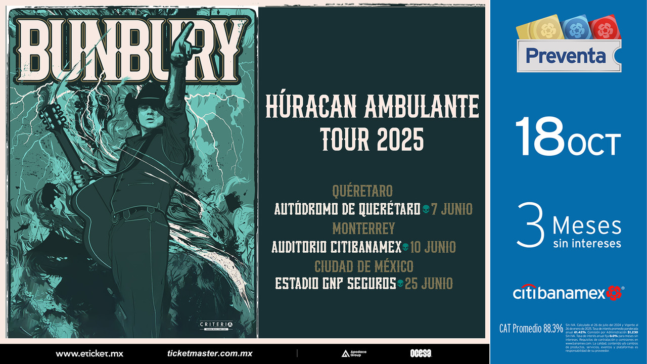 El tour comenzará el 7 de junio en el Autódromo de Querétaro, para luego seguir en el Auditorio Citibanamex de Monterrey el 10 de junio y culminará en el imponente Estadio GNP de la Ciudad de México el 25 de junio. Los fanáticos podrán disfrutar de un recorrido musical por la carrera de Bunbury, que abarca desde los himnos que marcaron toda una época, como “…Y al Final” y “Lady Blue”, hasta las piezas más recientes de su repertorio.