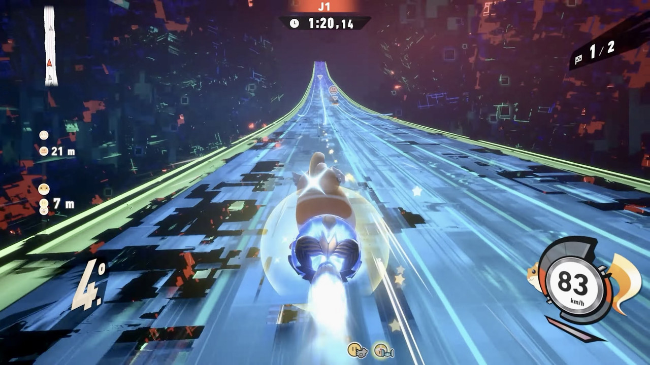 Hay momentos en los que el ritmo musical coincide tan bien con la carrera que casi parece coreografiado. Y cuando eso pasa, cuando tu vuelo rosado entra en ese flow mágico donde todo se sincroniza, el juego alcanza esa categoría que pocos títulos logran: el trance jugable. El tipo de estado mental donde no piensas, solo reaccionas, respiras, derrapas, vuelas y sigues. Es hermoso.