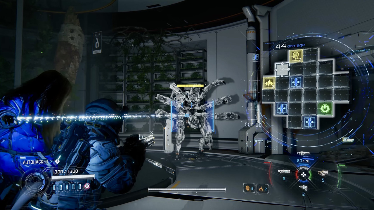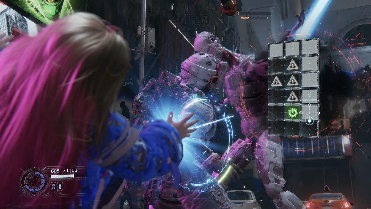 Para derrotar enemigos, primero necesitas hackearlos mediante un minijuego donde navegas entre nodos. Sí, básicamente es como resolver un mini puzzle en medio del caos.