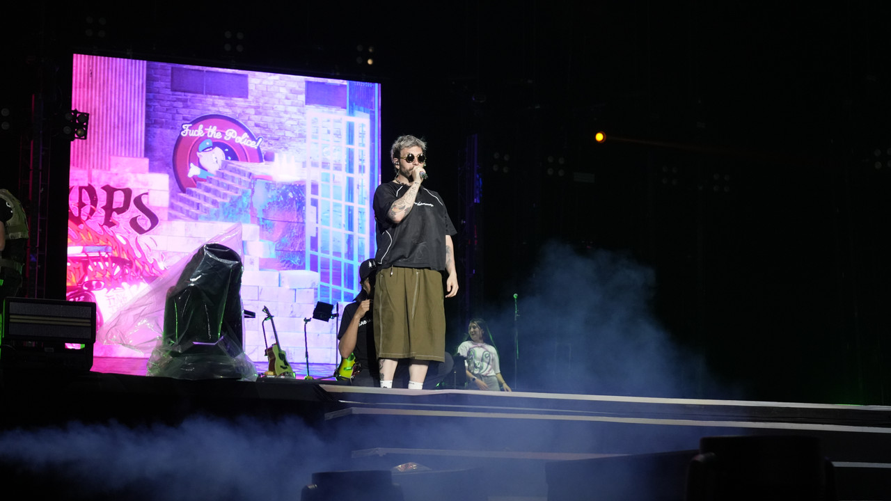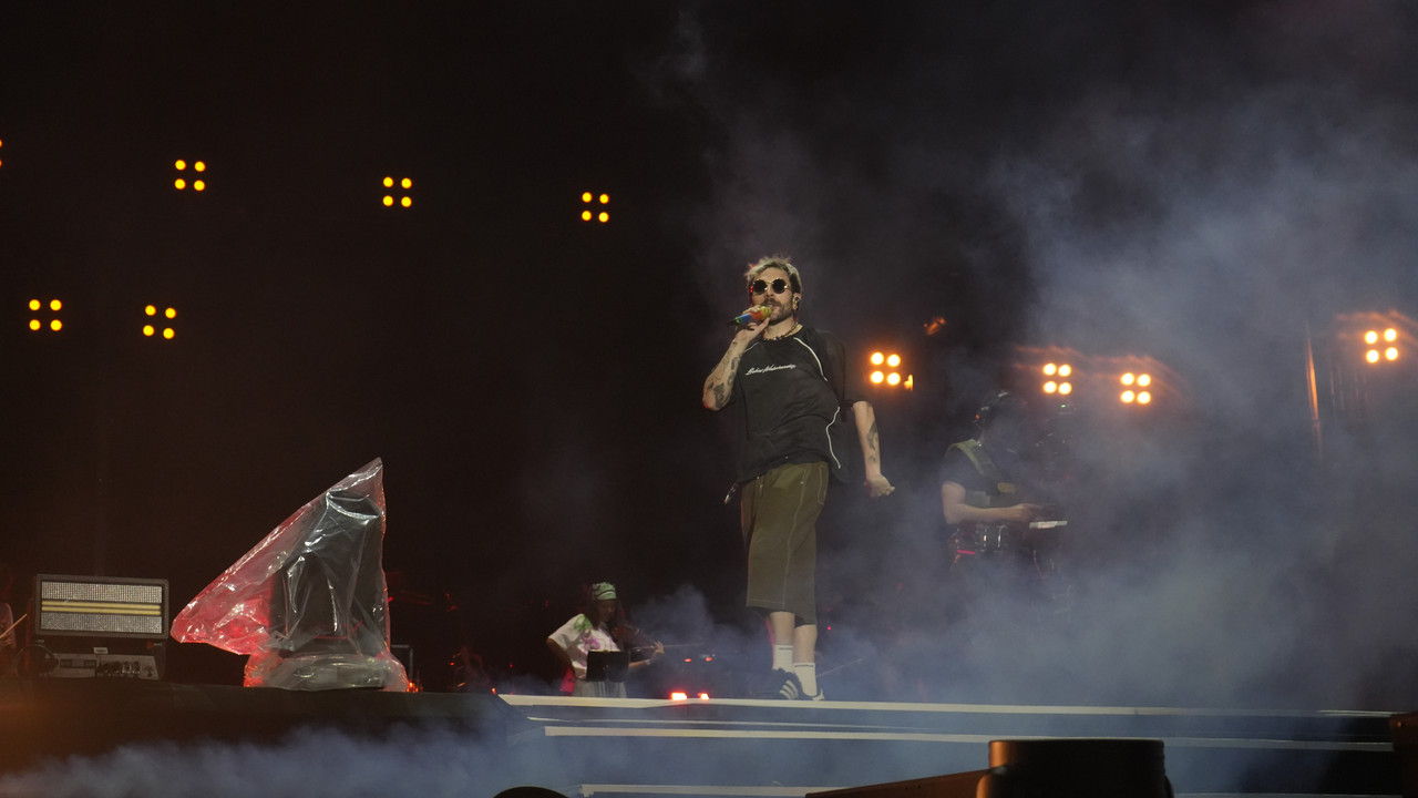 Tras un breve intermedio, el estadio estalló en gritos cuando las luces se apagaron y Sabino apareció en escena con una chaqueta negra y bermudas cafés. Caminando por la pasarela, saludó al público y arrancó con «Con todo respeto» y «Sab Hop», acompañado de efectos de fuego y una producción imponente.